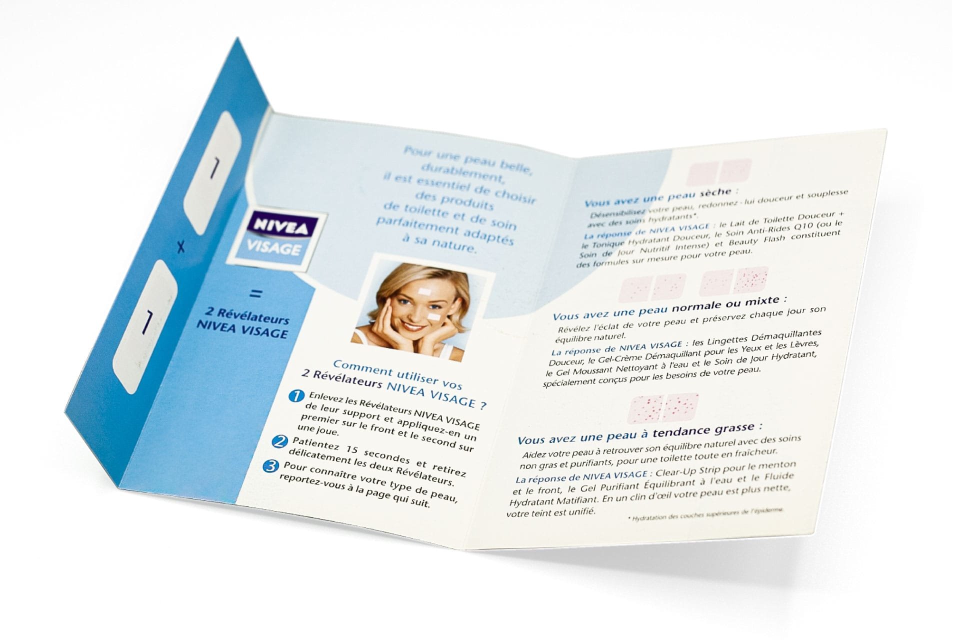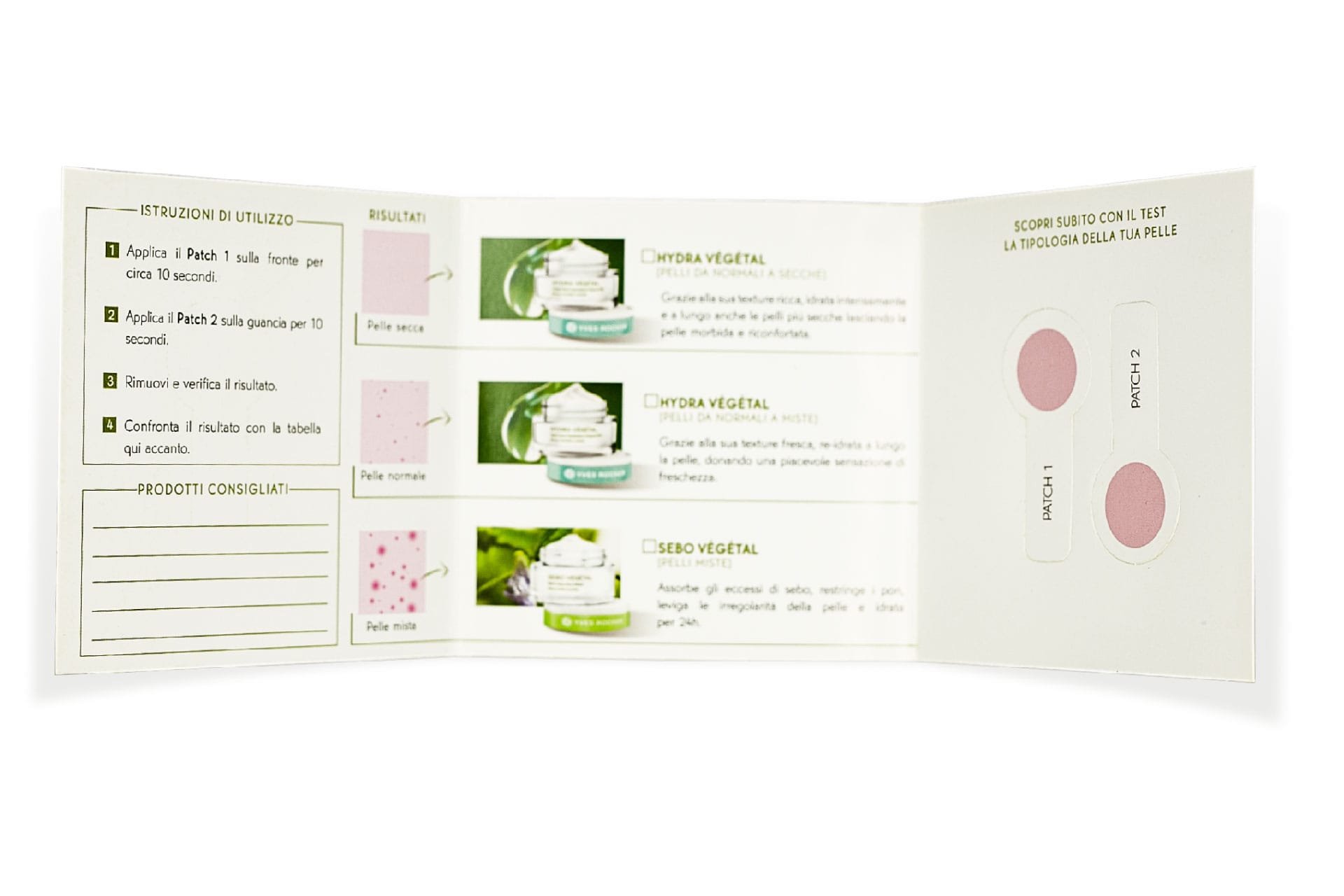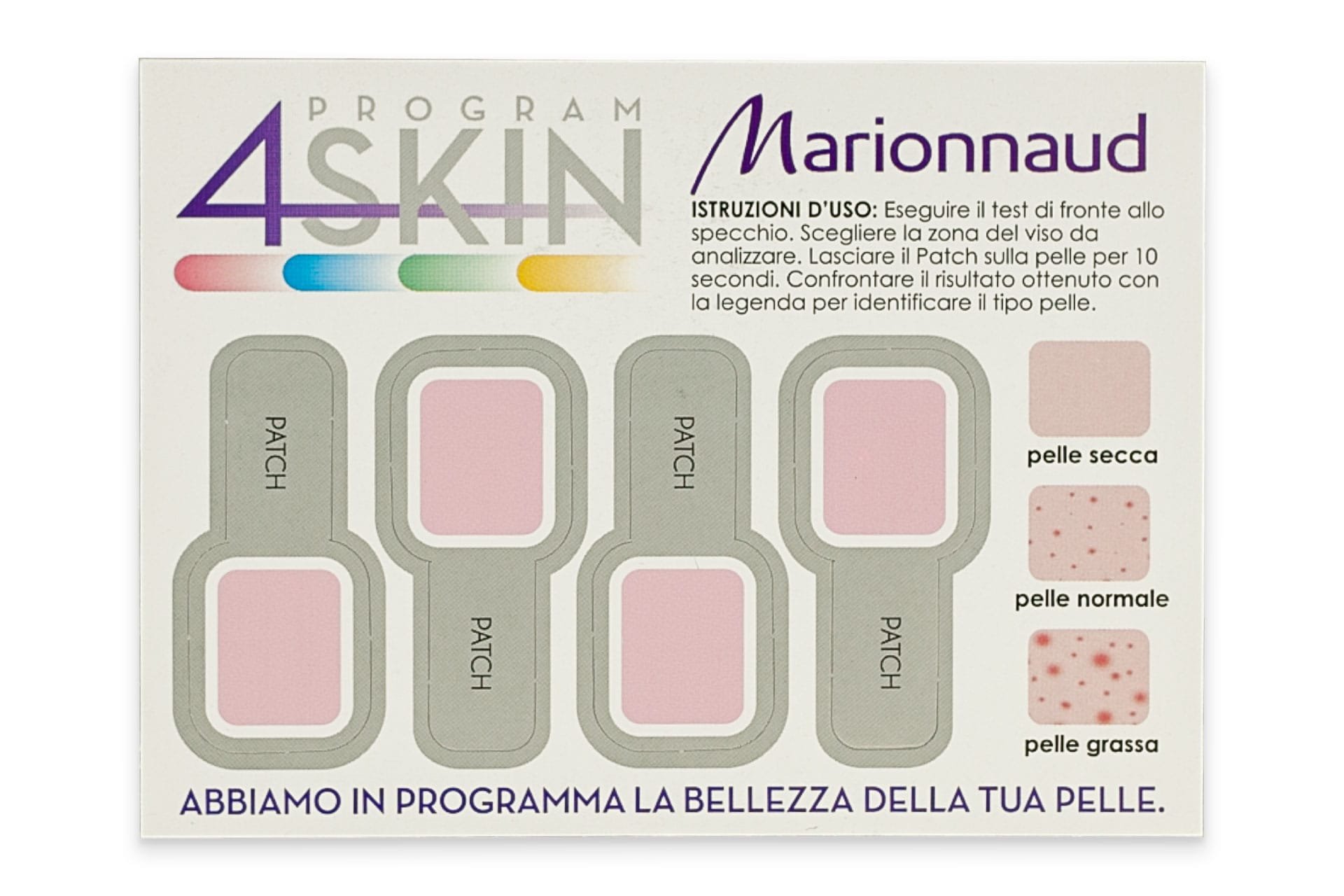 Cosmetic test that allows you to find out your skin type (dry-normal-oily) easily and in a few seconds, allowing you to recommend the most suitable cosmetic treatment. Non-invasive and single-use. Possibility of printing on the triptych.
