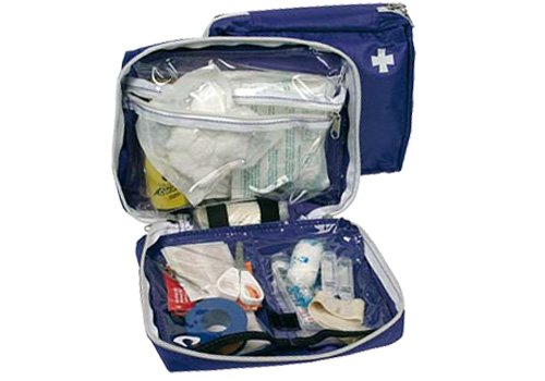 Botiquín de tela compuesto por: 6 apósitos, 2 toallitas jabonosas, 2 toallitas alcohol, tijeras, pinzas, torniquete látex, gasas, esparadrapo, guantes látex, mascarilla boca a boca, 2 suero fisiológico y pack frío.