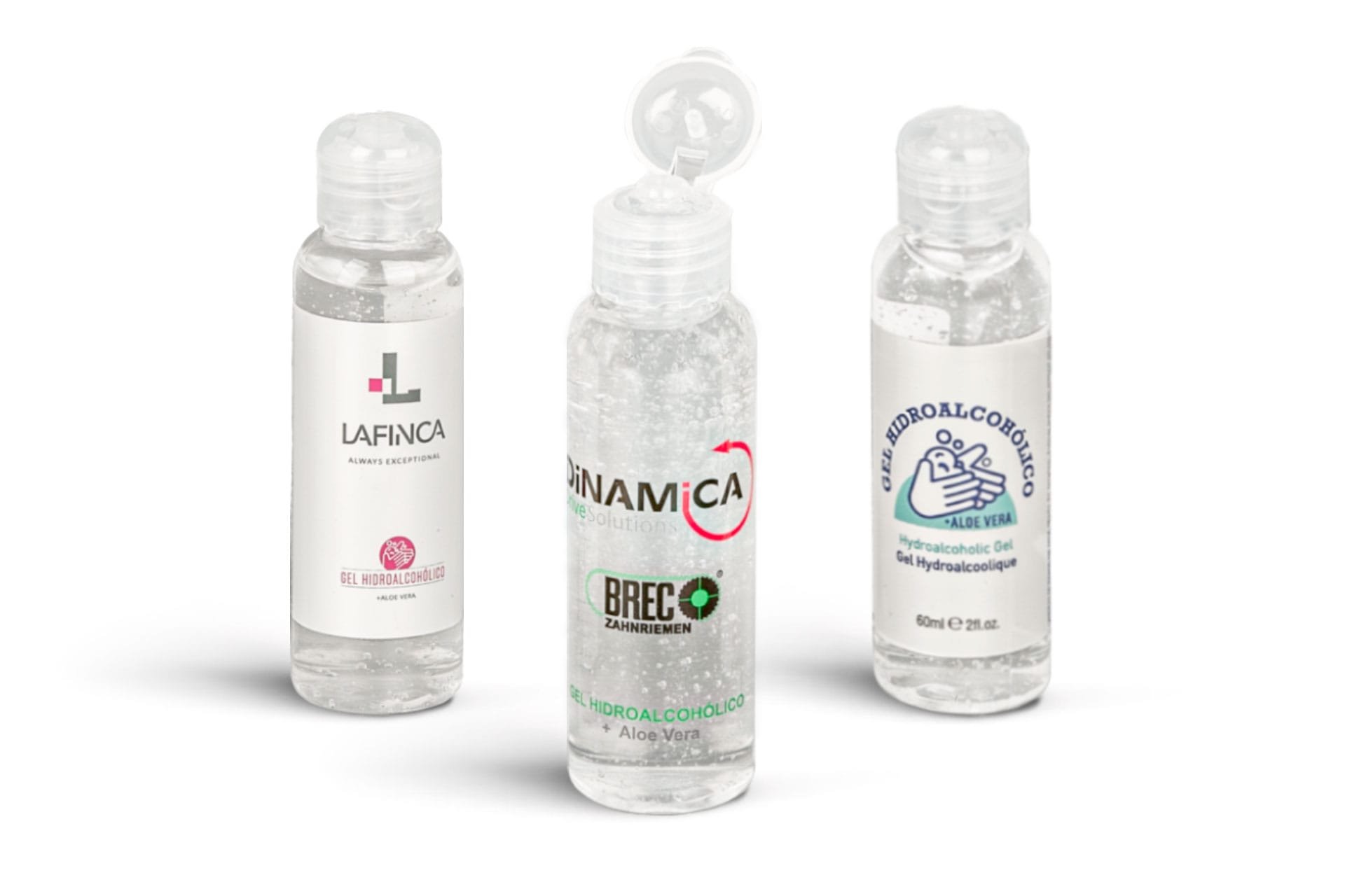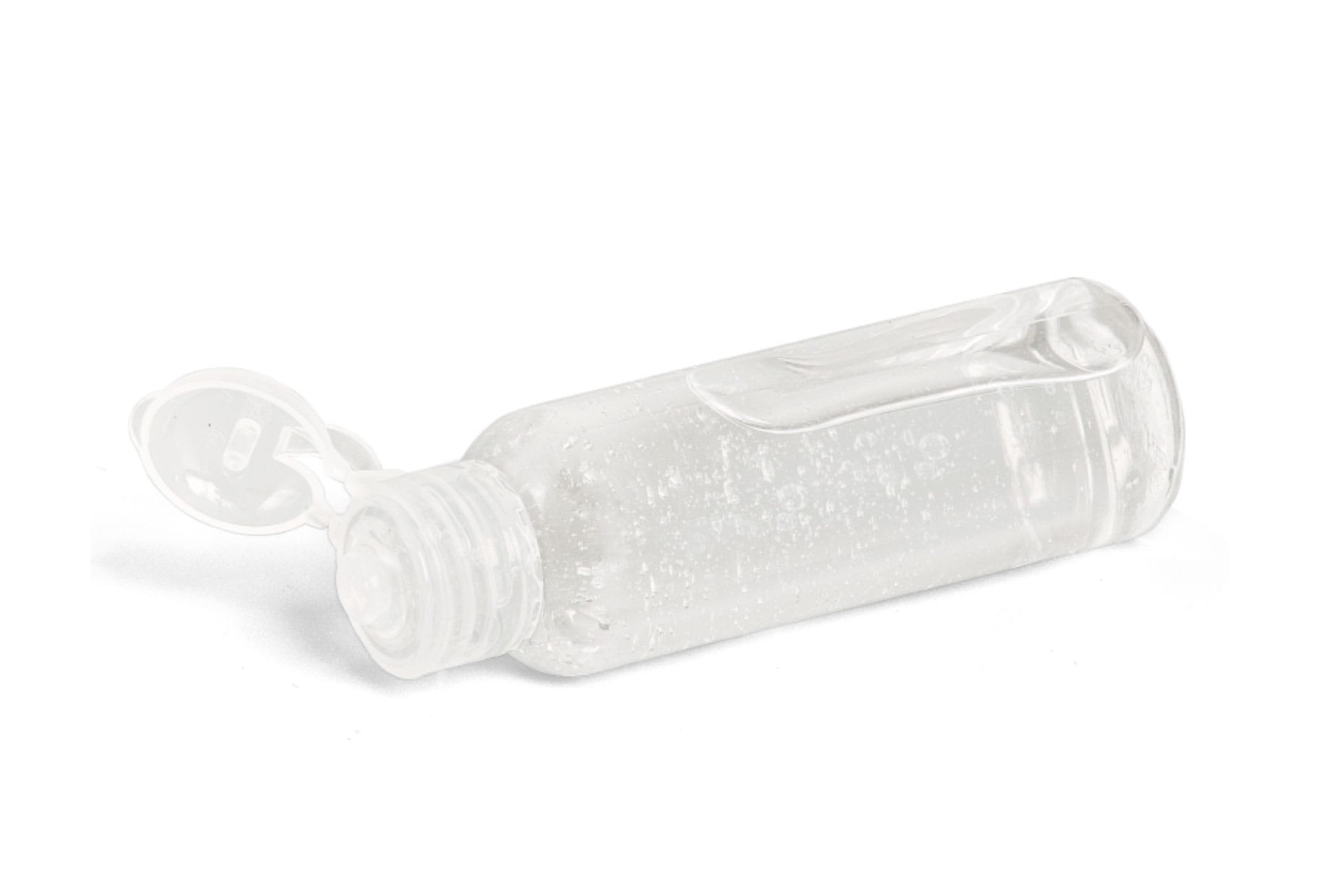 Botella de 60 ml con gel hidroalcohólico (70% alcohol). Tapón tipo bisagra, rellenable.