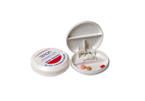 Round PVC pill dispenser, opaque white with cutter, pill cutter, with 2 compartments.