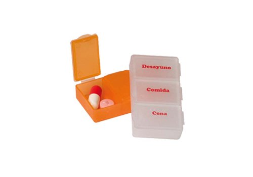 Pastillero de PVC rectangular diario con tres compartimentos individuales: desayuno, comida y cena.
