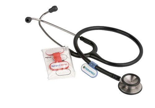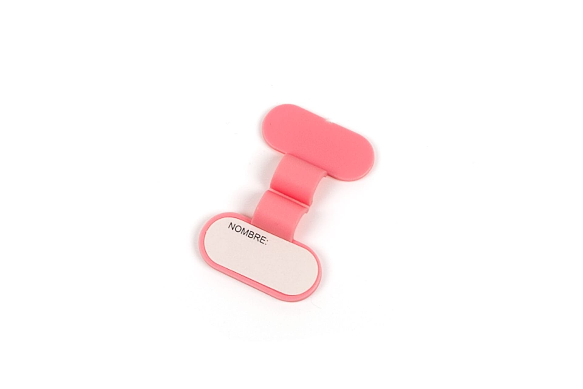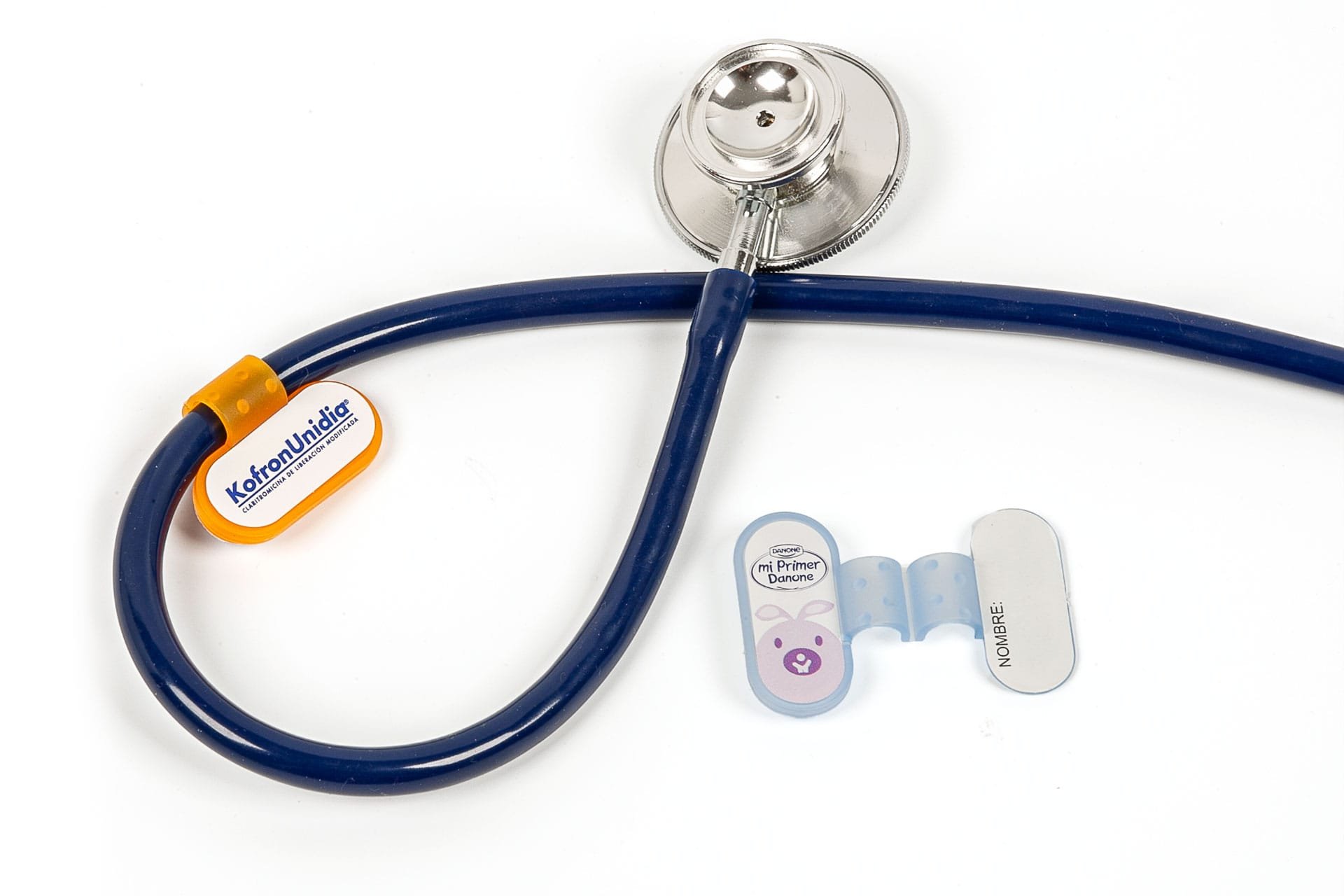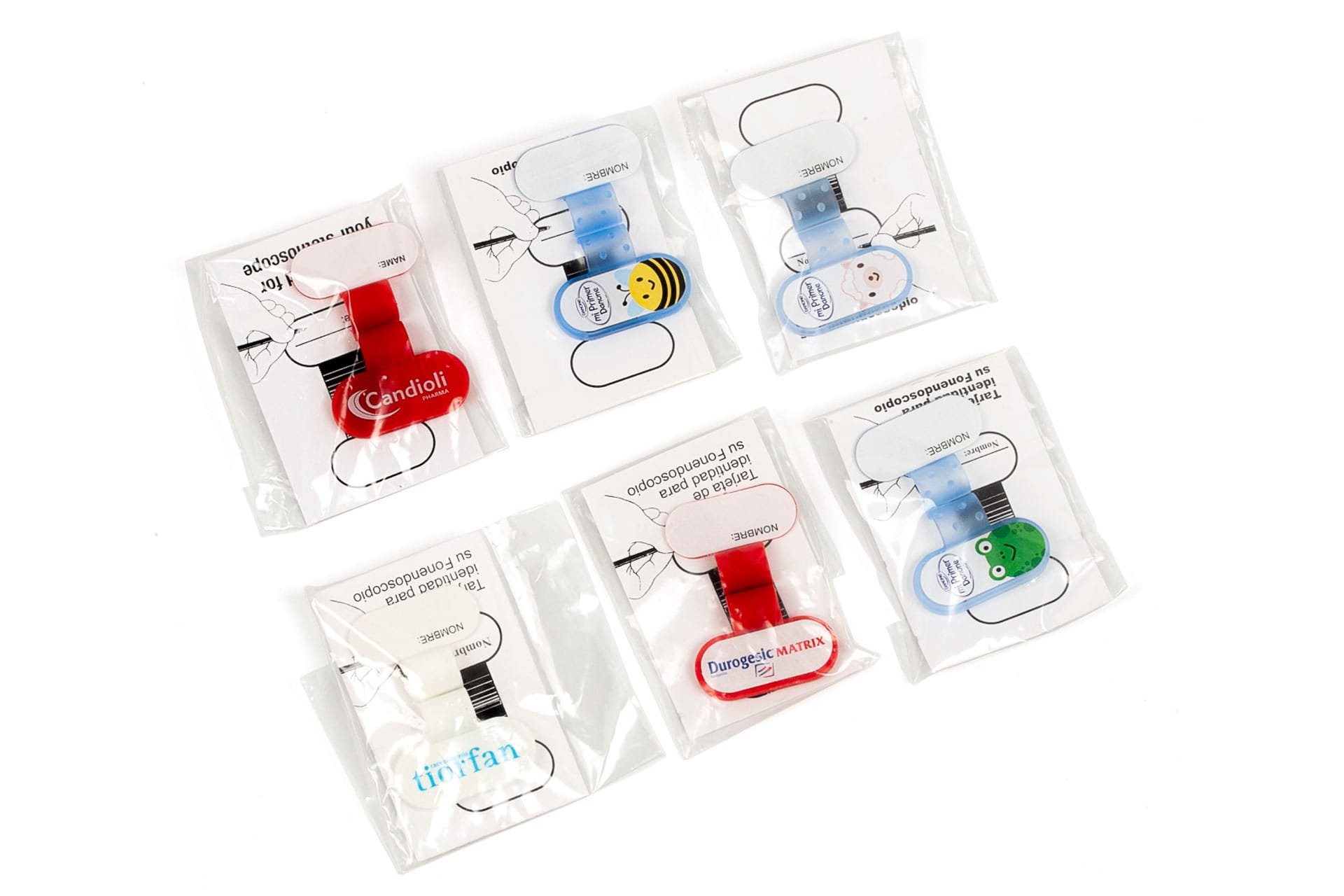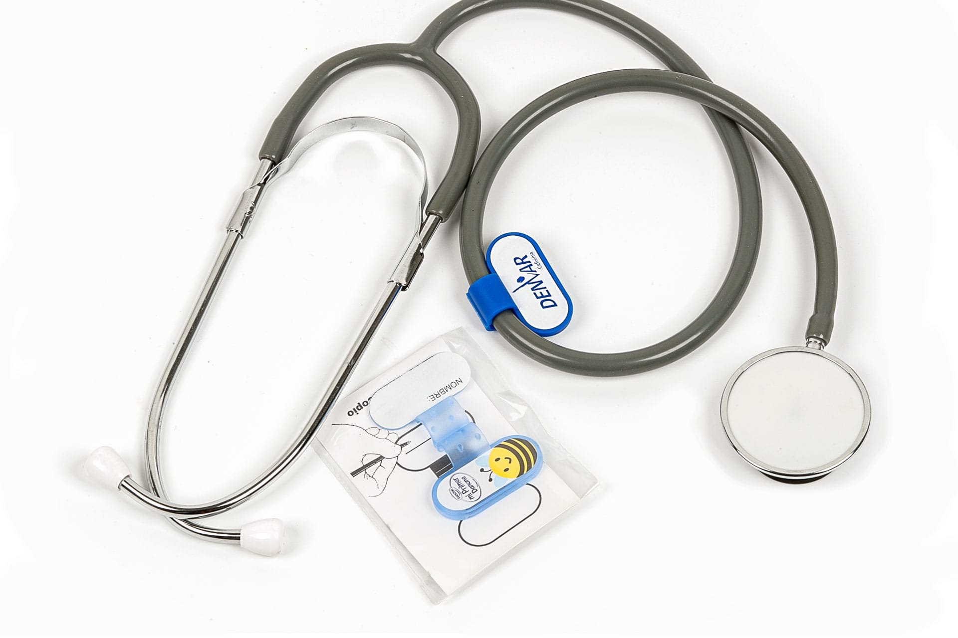 Identificador para fonendoscopio. Incluye un soporte de plástico para sujetar al tubo del fonendoscopio, etiqueta para escribir a mano el nombre del doctor o enfermera y instrucciones de uso.