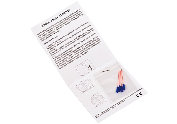 4 recambios de monofilamentos. Díptico plegable y personalizable, con cuatro recambios monofilamento. El monofilamento es una herramienta para realizar un diagnóstico preliminar de la neuropatía sensorial en la diabetes. El filamento de presión 5.07 ha sido aceptado como el estándar médico para mostrar el nivel mínimo de sensación protectora en el pie. La fuerza de presión requerida para doblarlo es de 10 g. (+-5% desviación estándar).