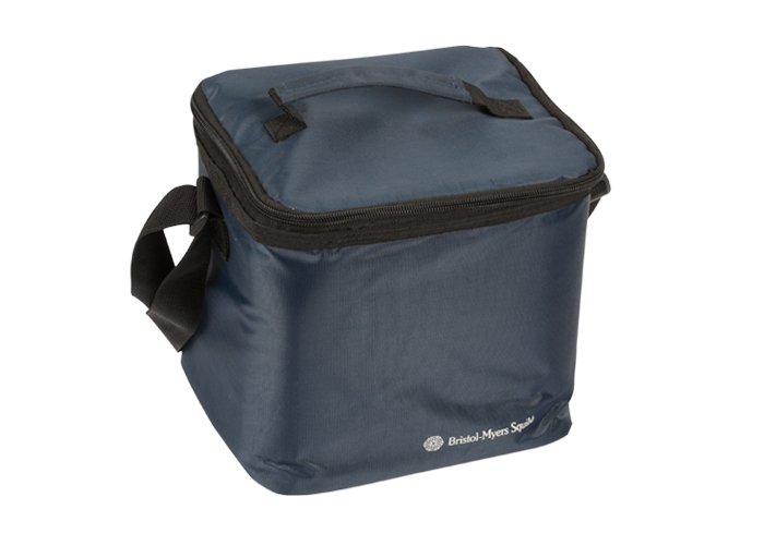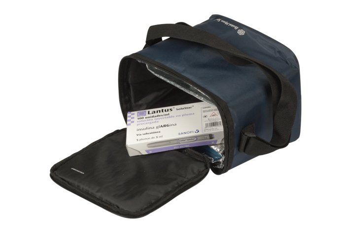 Bolsa de nylon forrada en el interior con un material aislante para mantener el frío. Dos bolsillos en el interior para guardar 2 acumuladores (incluidos).