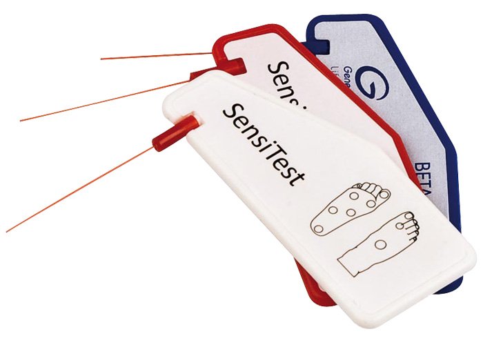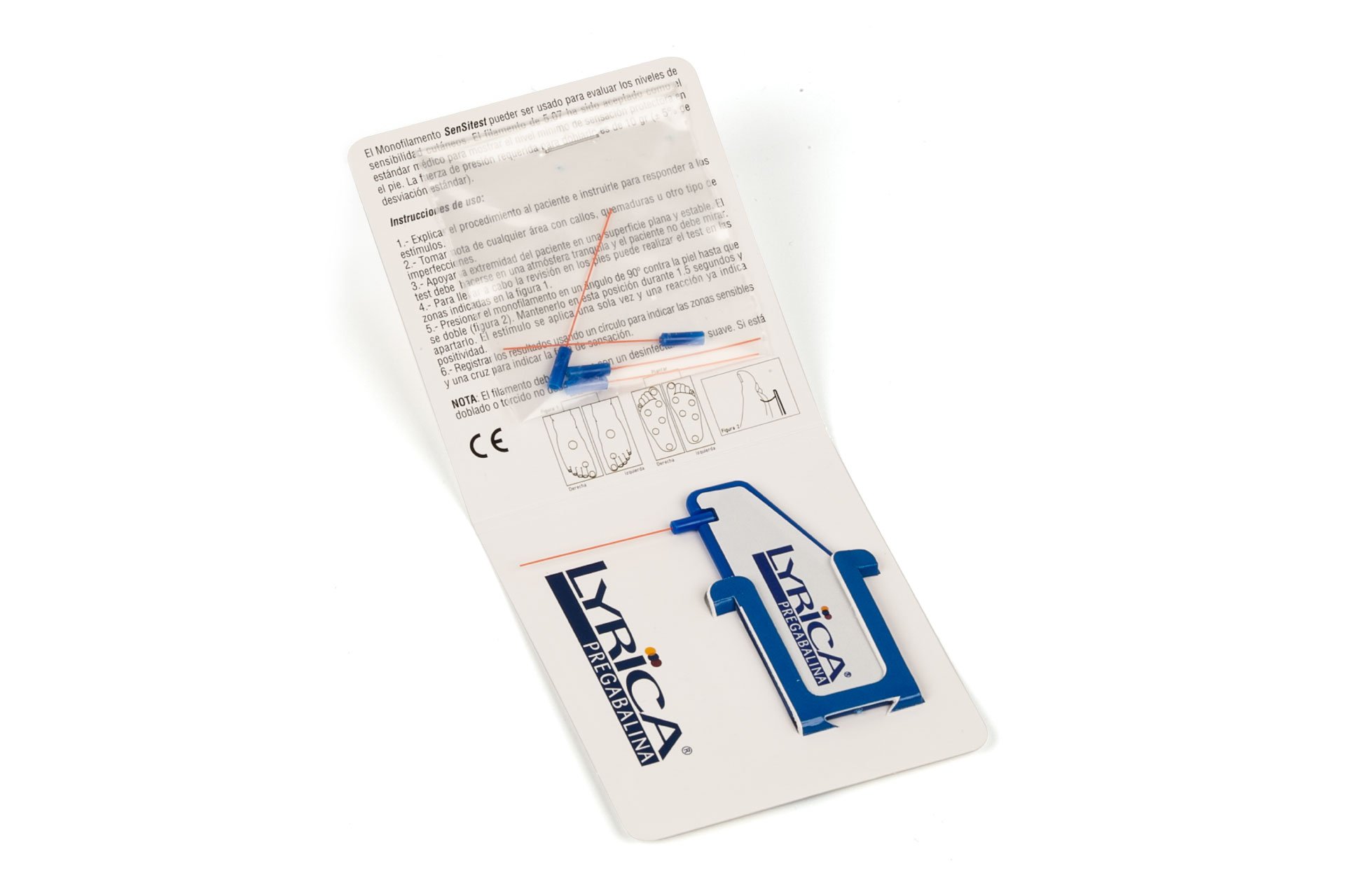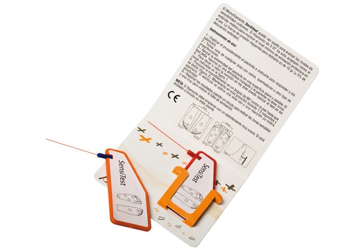 El monofilamento es una herramienta para realizar un diagnóstico preliminar de la neuropatía sensorial en la diabetes. El filamento de presión 5.07 ha sido aceptado como el estándar médico para mostrar el nivel mínimo de sensación protectora en el pie. La fuerza de presión requerida para doblarlo es de 10 g. (+-5% desviación estándar). El monofilamento está disponible en los colores: rojo, azul, negro y blanco.
