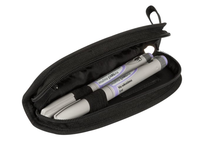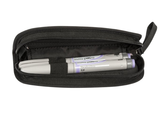 Estuche portátil de nylon flexible con capacidad para 2 bolígrafos de insulina. Asa para poder llevarlo mejor.