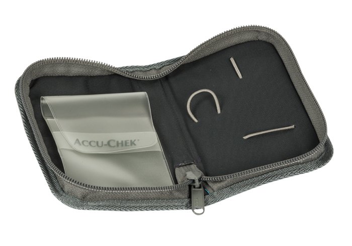 En el interior funda de PVC para guardar el aparato de medir insulina y gomas en el otro lado para sujetar el porta agujas y el bolígrafo de insulina.