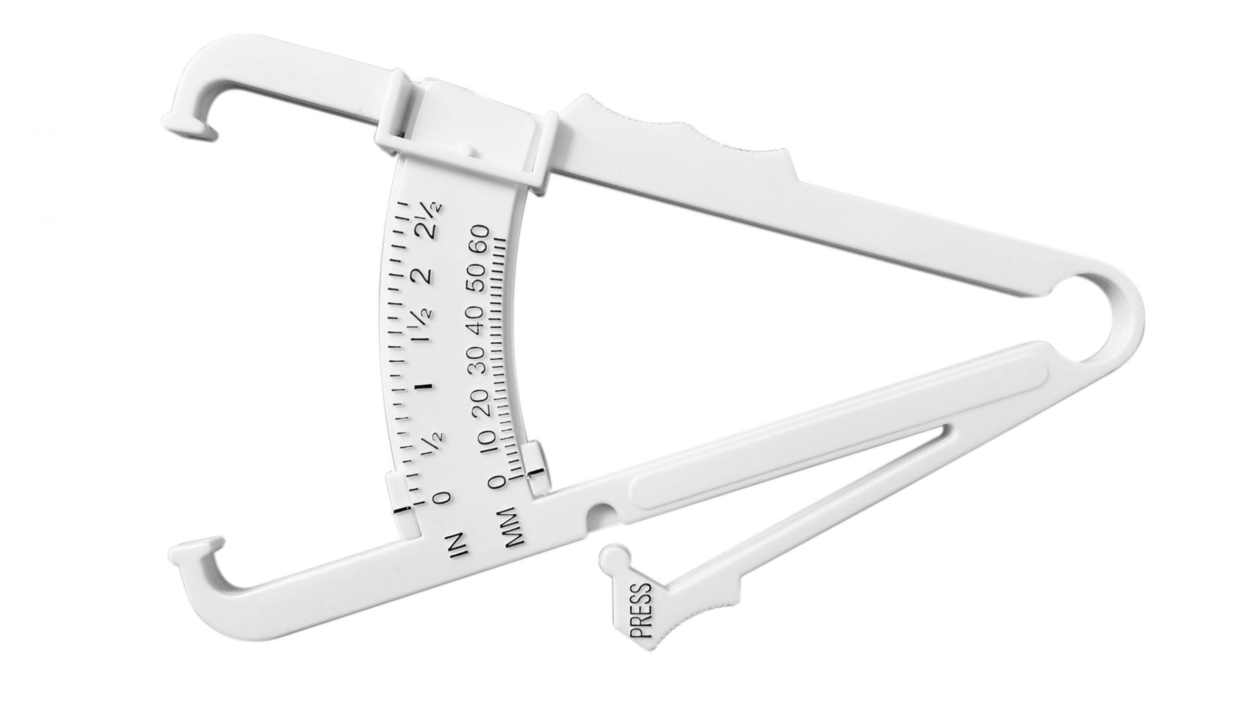 Medidor de grasa corporal. El plicómetro es un instrumento que mide el pliegue cutáneo. Al hacerlo en varios sitios del cuerpo, se puede calcular el porcentaje de grasa corporal. Rango de medición 0-60 mm. Disponible en color blanco o marfil.