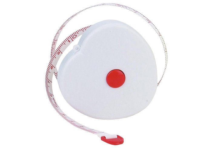 Metro en forma de corazón con cinta flexible y botón de rebobinado automático.