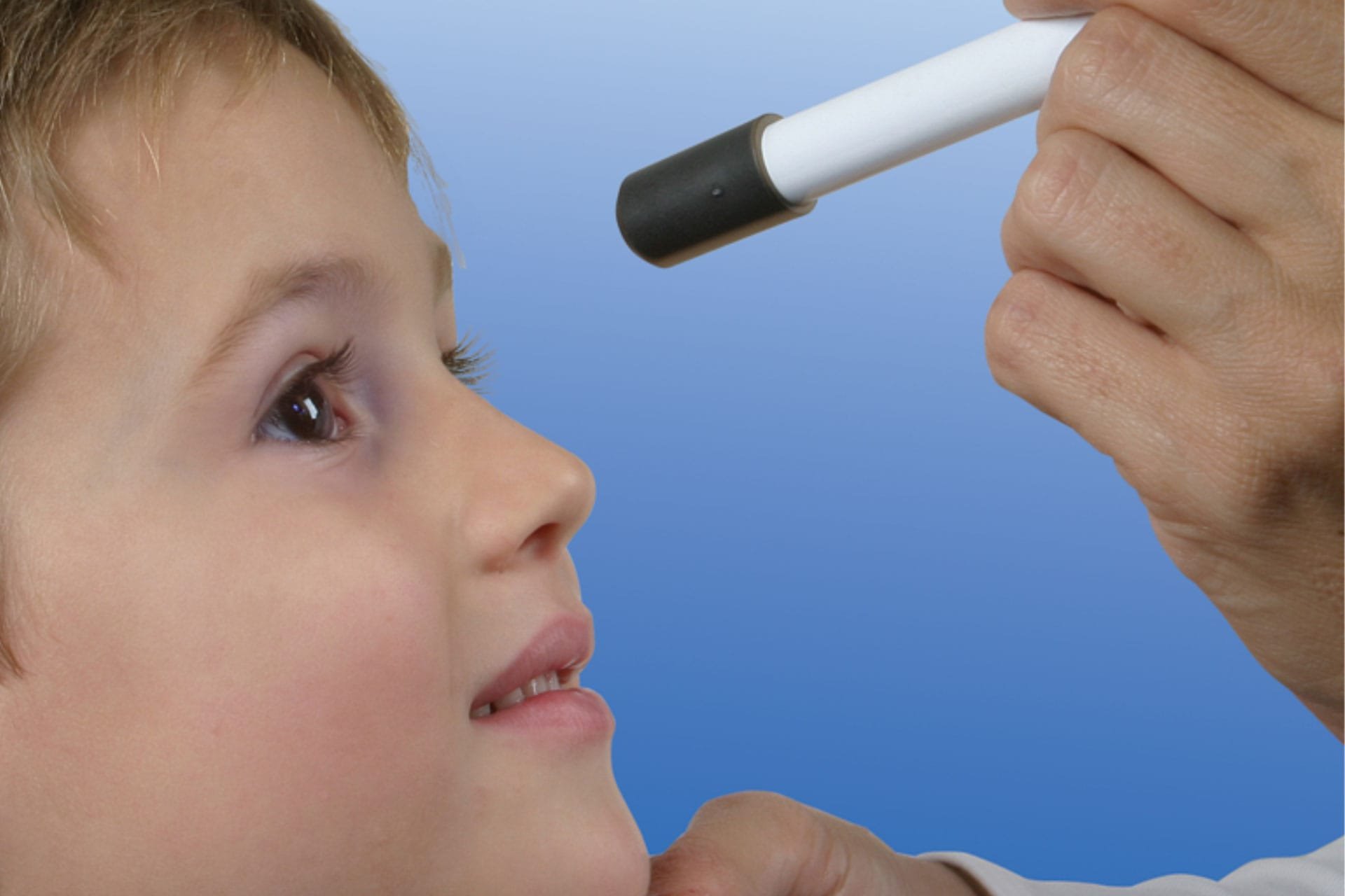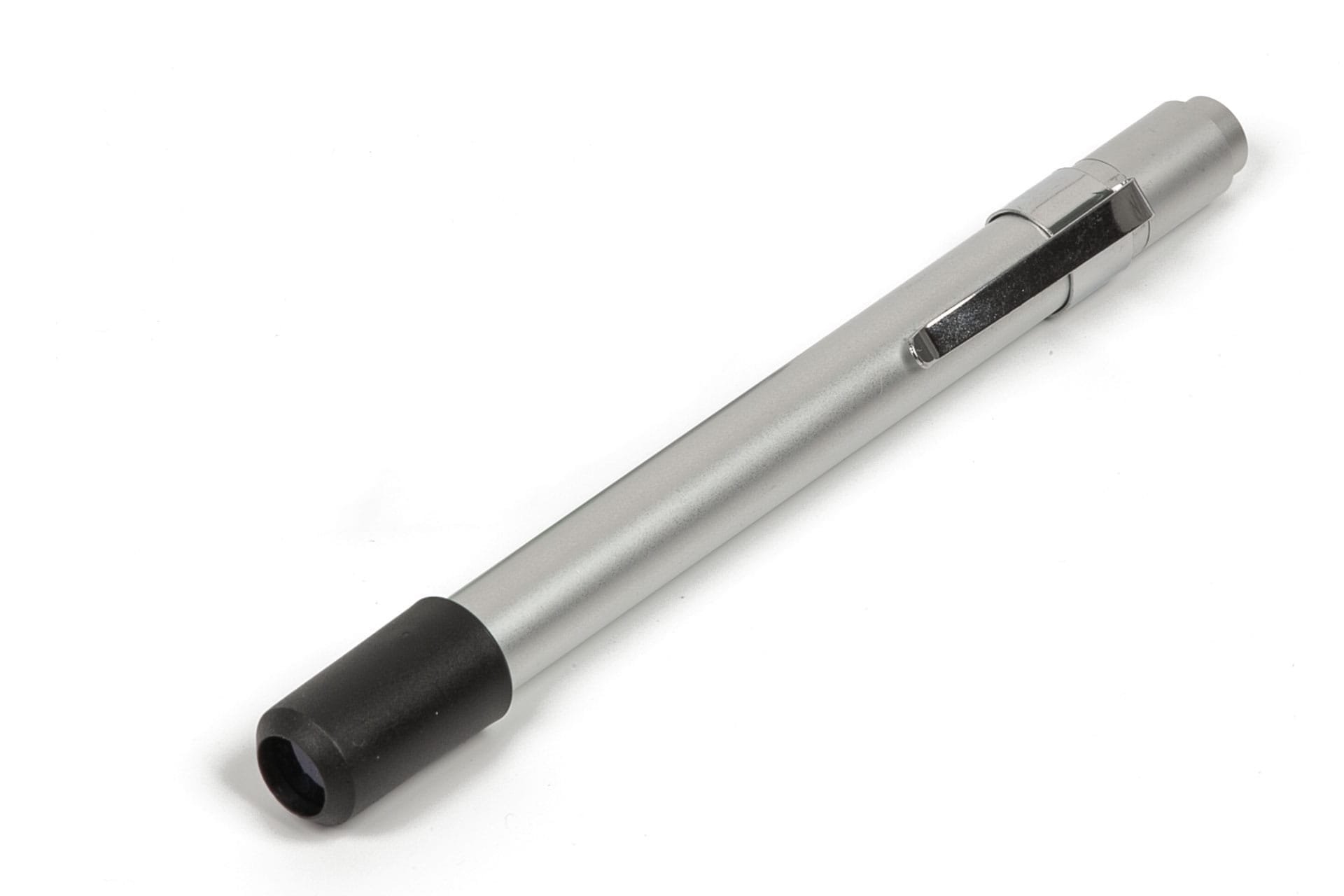 Linterna con filtro de cobalto. Linterna diagnóstica de aluminio anodizado acabado brillante, con filtro de cobalto (luz azul) y con clip metálico para sujeción. Encendido mediante un pulsador. Entregada en caja individual blanca.