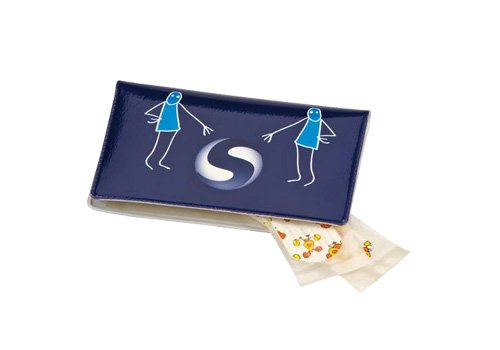 Carterita de PVC, contenedora de 10 apósitos neutros o impresos (medida apósitos: 70×20 mm).
