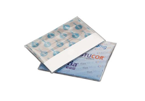 Funda plástico transparente con 20 apósitos neutros o impresos (medida apósitos: 70 x 20 mm). En el interior de la funda hay un cartón totalmente personalizable.