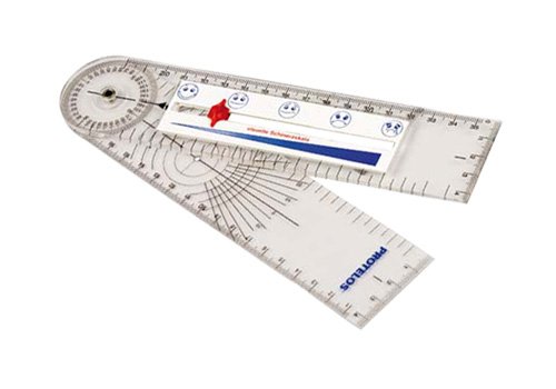 Goniómetro con Regla del dolor. Goniómetro y regla para el análisis del grado de dolor del paciente, con botón. Material: metacrilato. Contiene etiquetas estándar de Escala visual / Escala numérica y corredera. Posibilidad de personalizar las etiquetas.