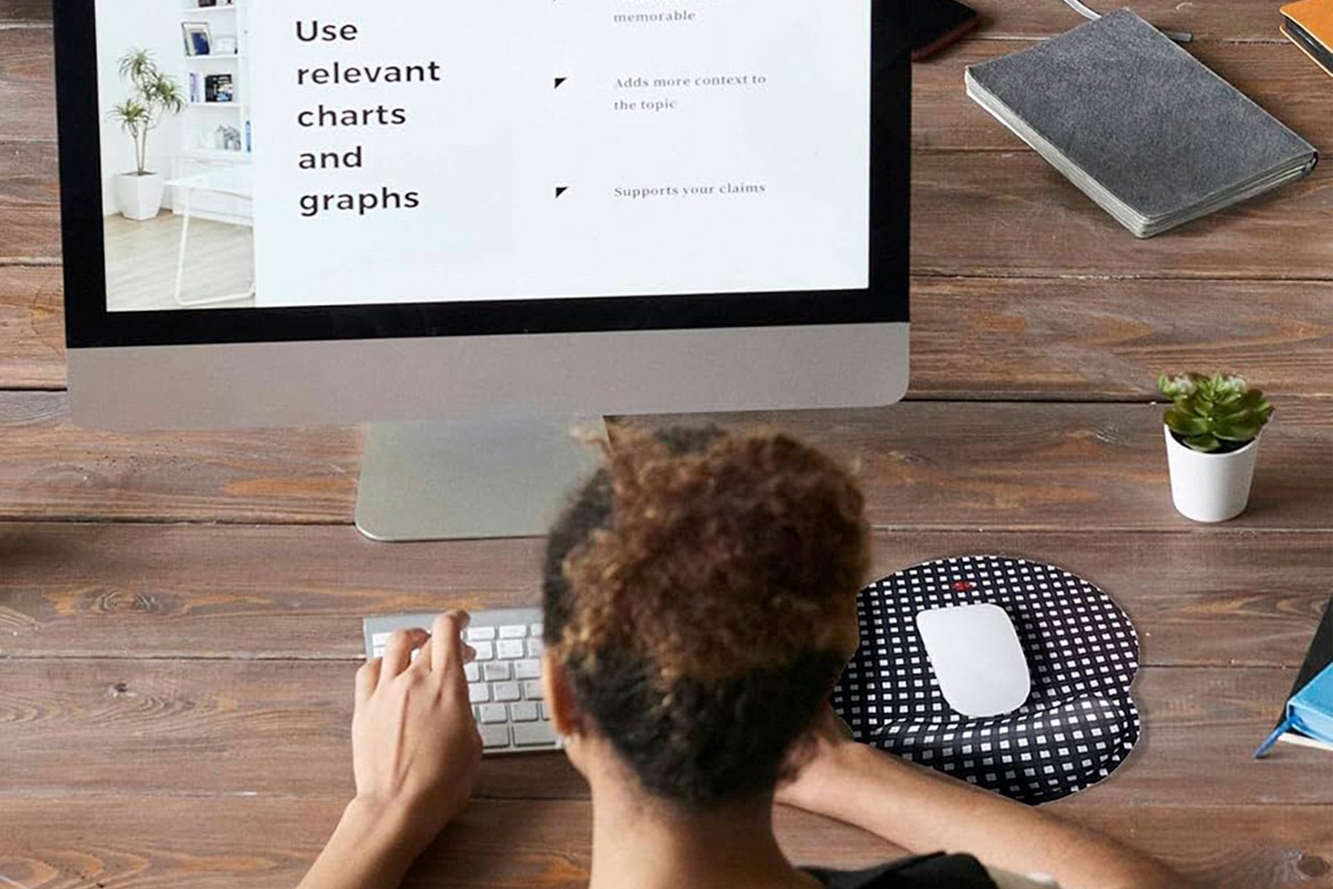 Alfombrilla ergonómica con reposamuñecas. Base de goma espuma alta densidad. Superficie textil con tratamiento anti-microbiano. Previene enfermedades como Tendinitis y Síndrome del Túnel Carpiano.