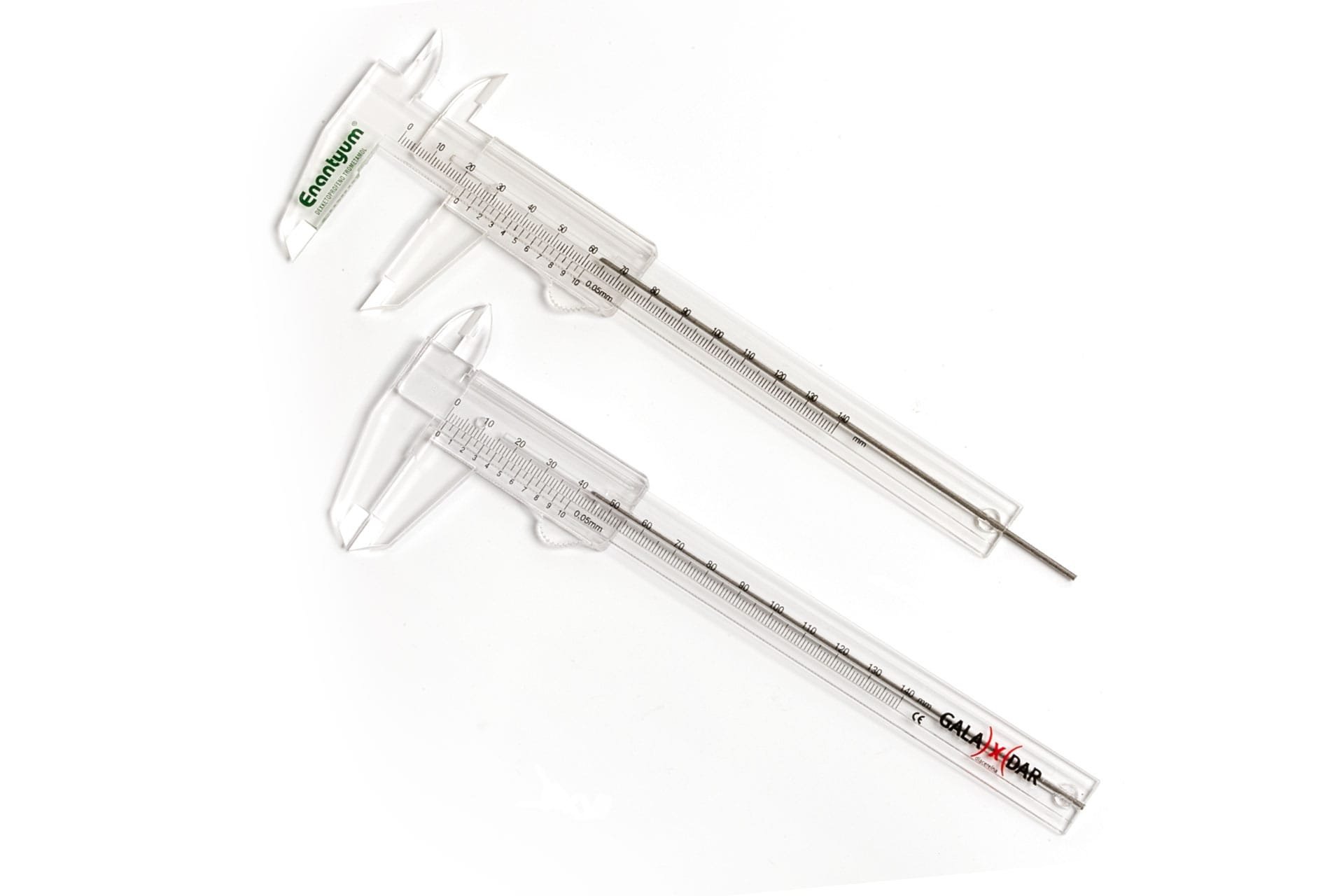 Transparent PVC caliper with black scale printed, measuring range up to 140 mm. Includes Vernier scale.
