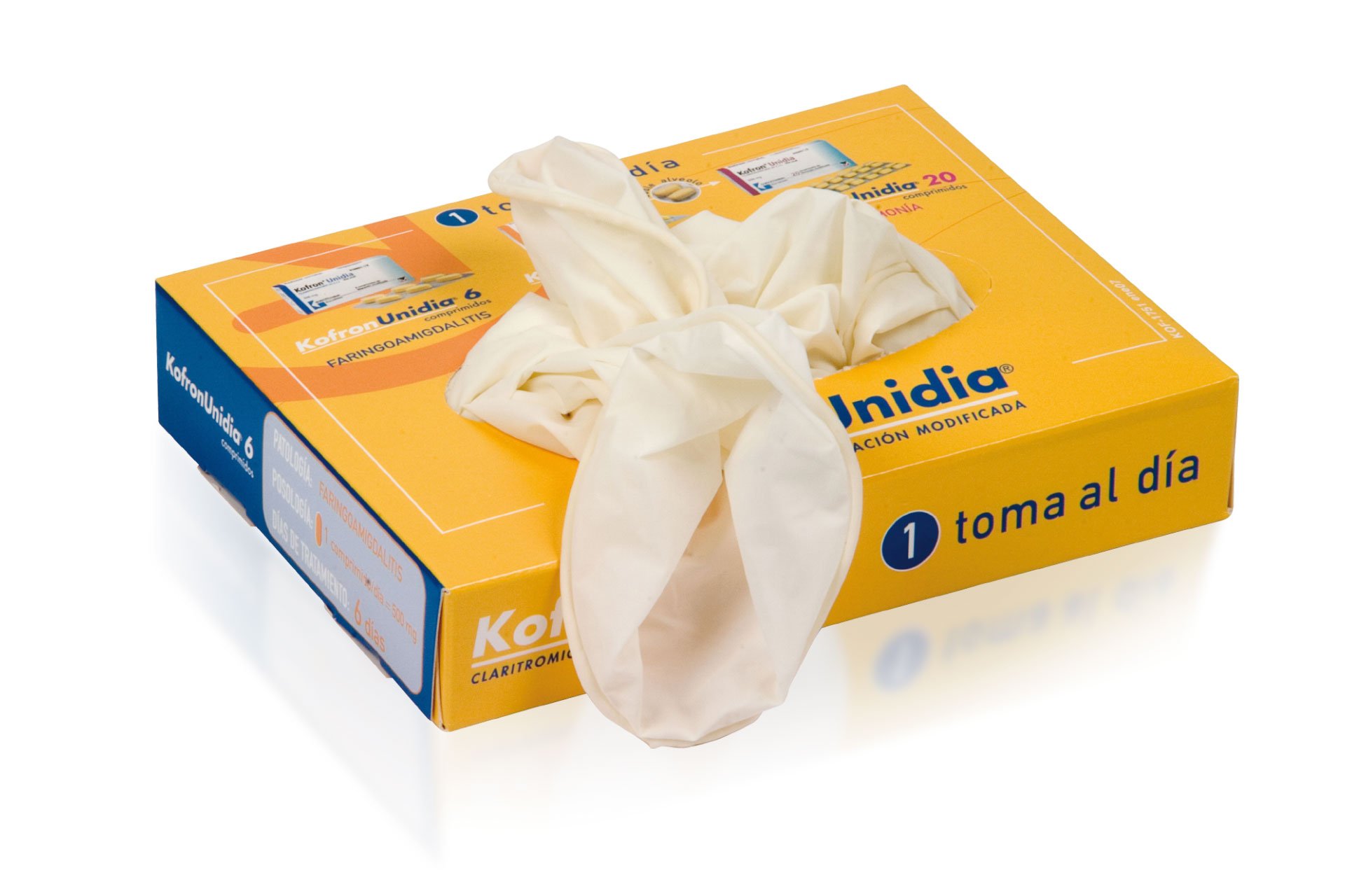Customisable rectangular cardboard box with 15 units of latex gloves.