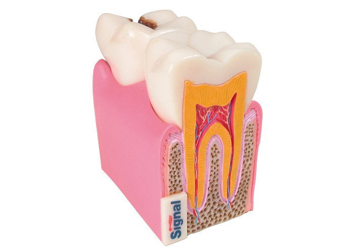 Modelo anatómico 3D en forma de muela, sujeto por una peana de PVC.