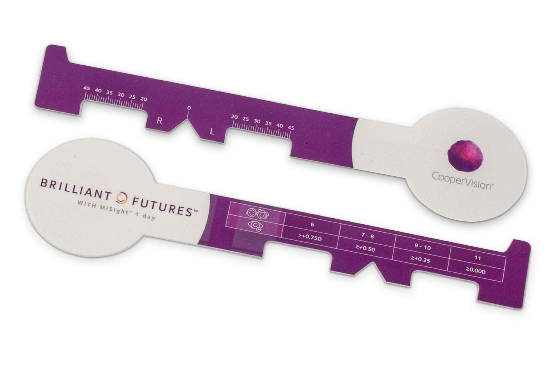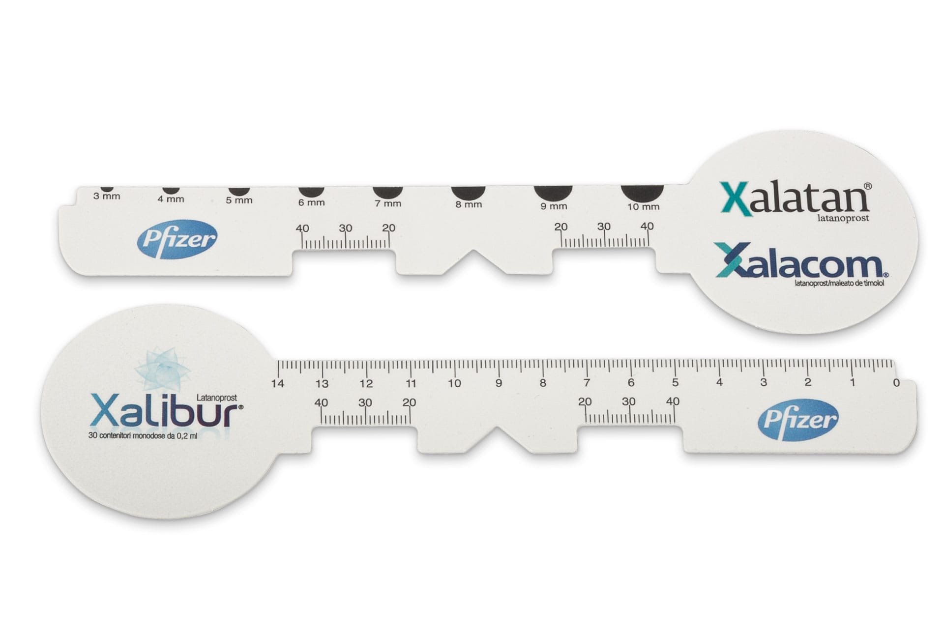Regla oftalmológica pupilómetro con oclusor incorporado. Fabricada en PP color blanco flexible. Presentada en paquetes de 25 unidades.