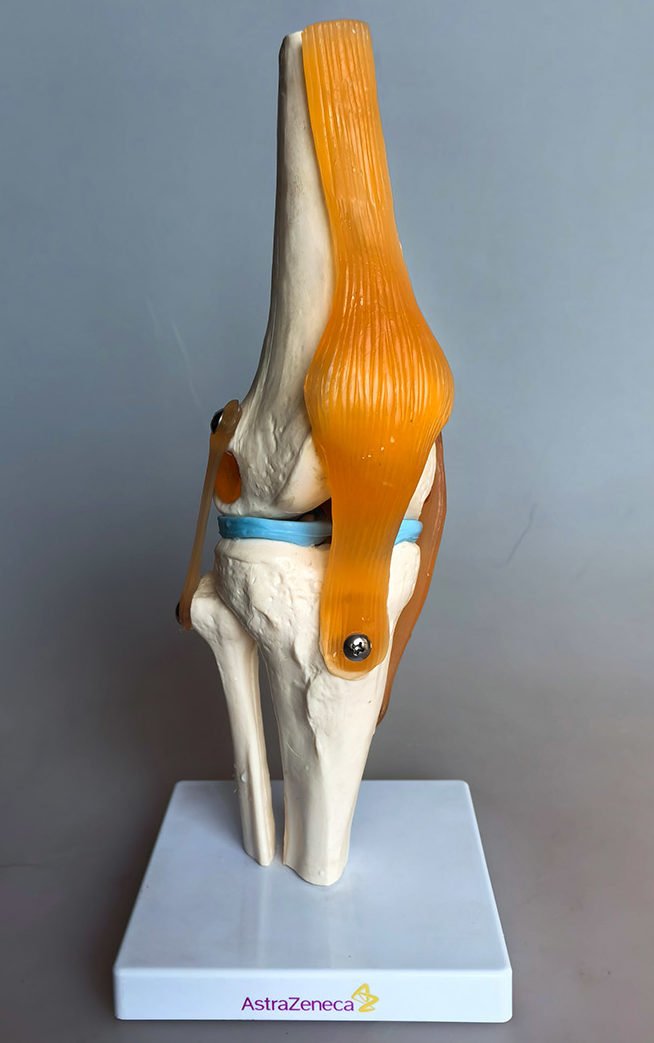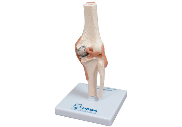 Modelo anatómico 3D en forma de rodilla, sujeto por una peana de PVC.