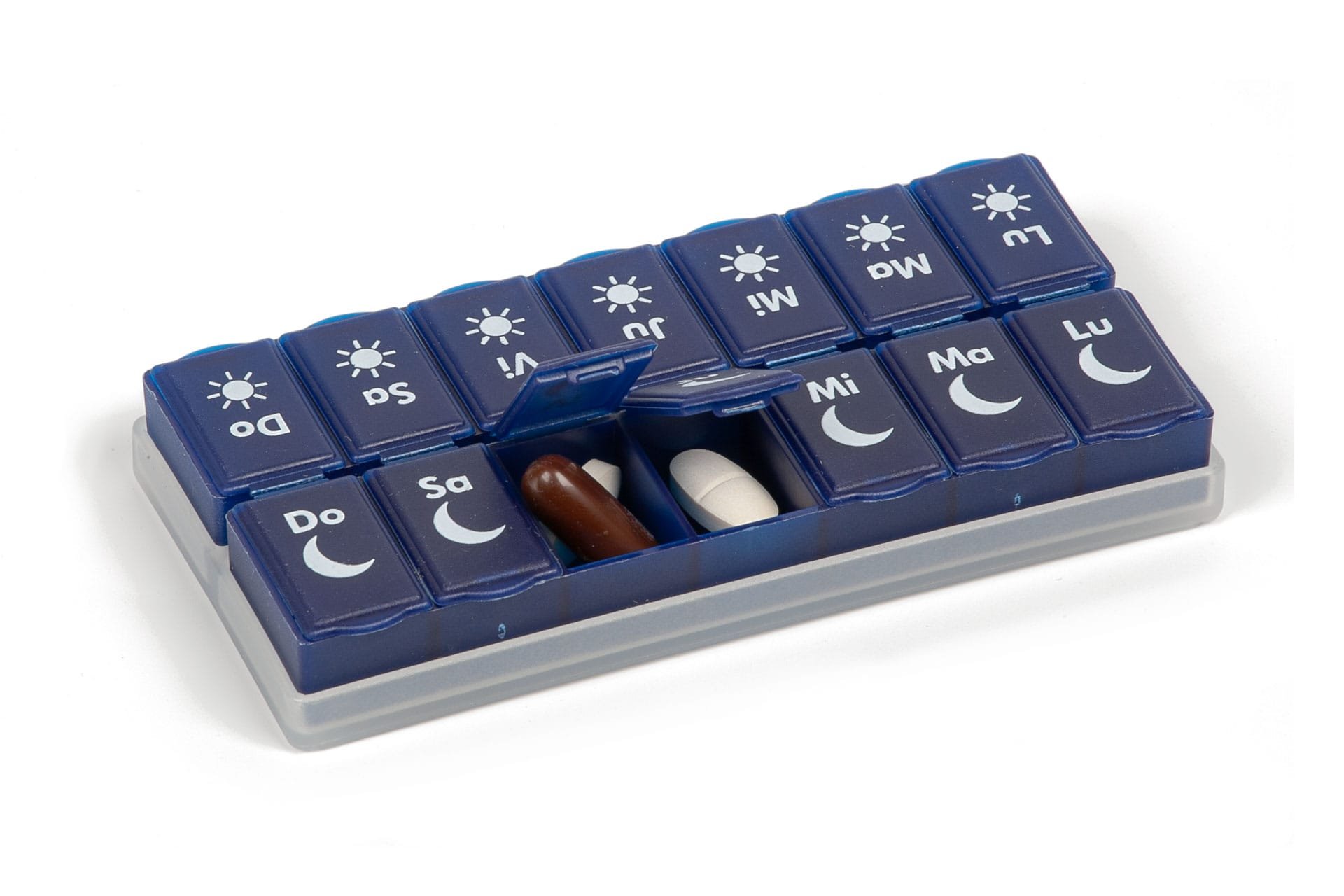 Daily pillbox with 7 compartments for the day and 7 compartments for the night.