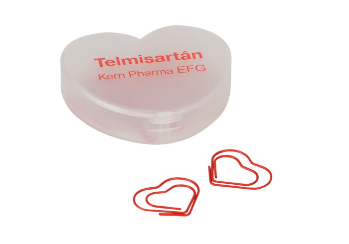 Heart-shaped plastic box, with 10 metal clips covered with a red heart-shaped PVC layer. Check available colours.
