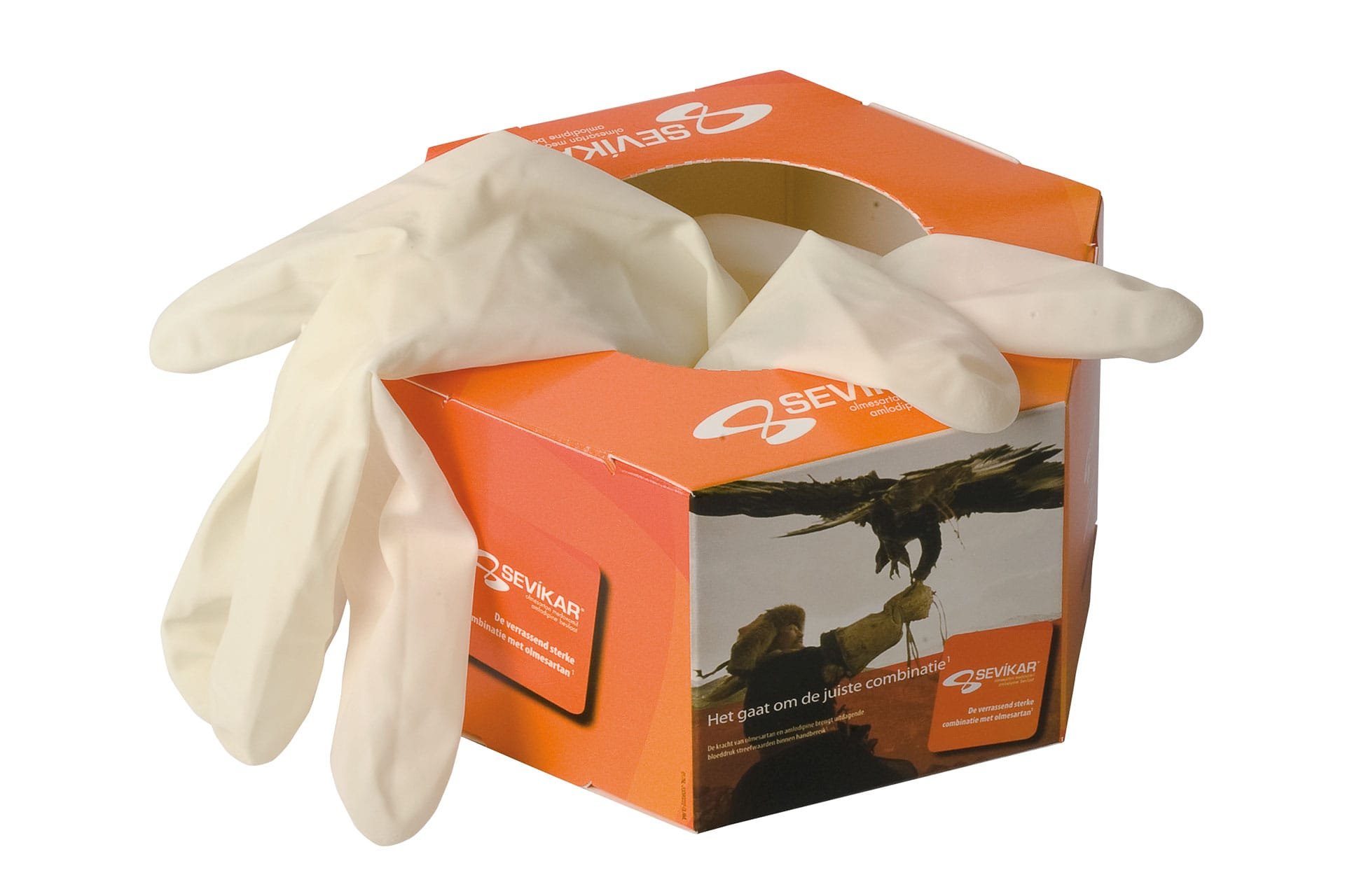 Hexagonal carton box with 18 gloves. Consult for glove types: latex, vinyl, or nitrile (depending on allergies).