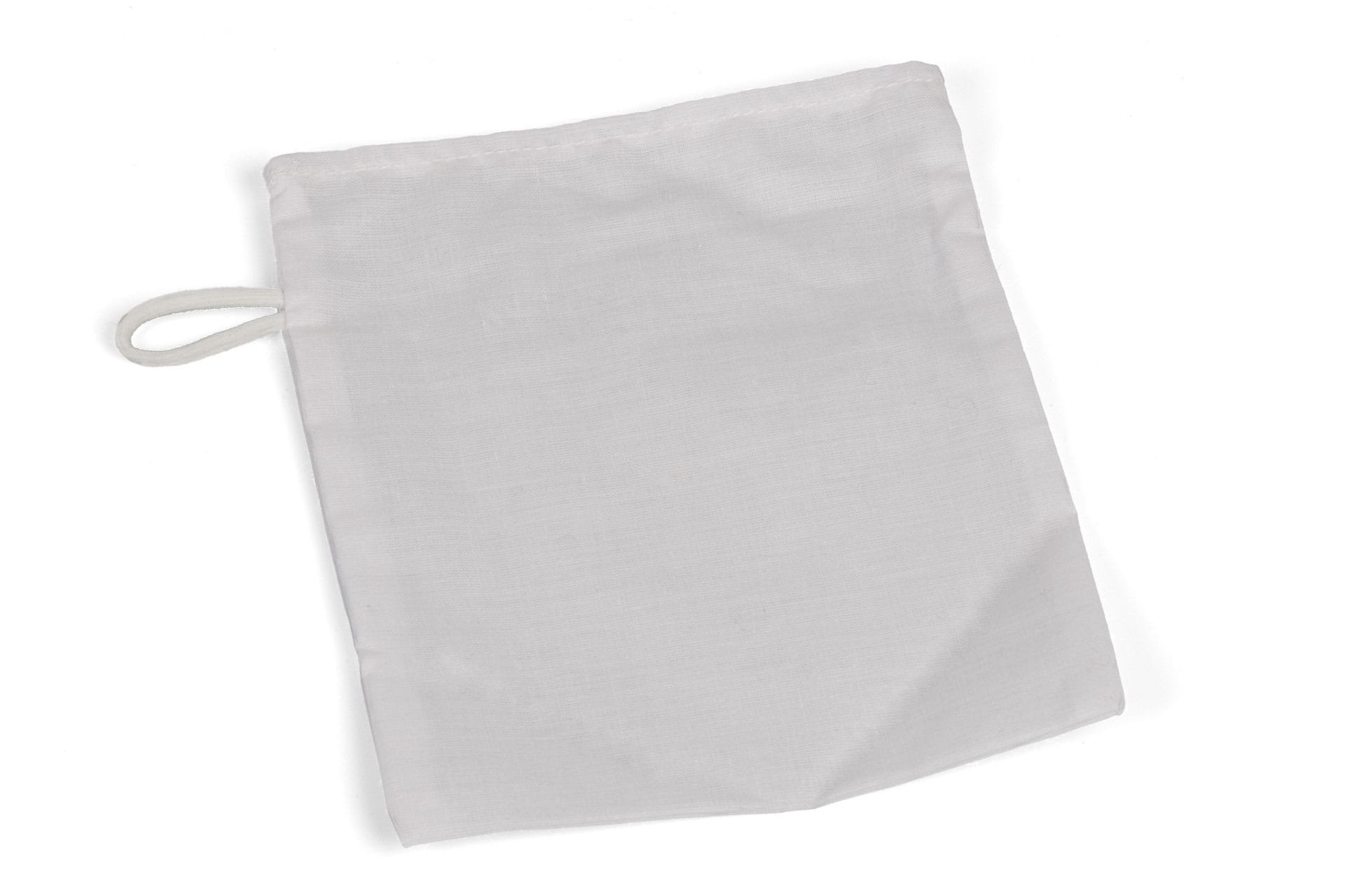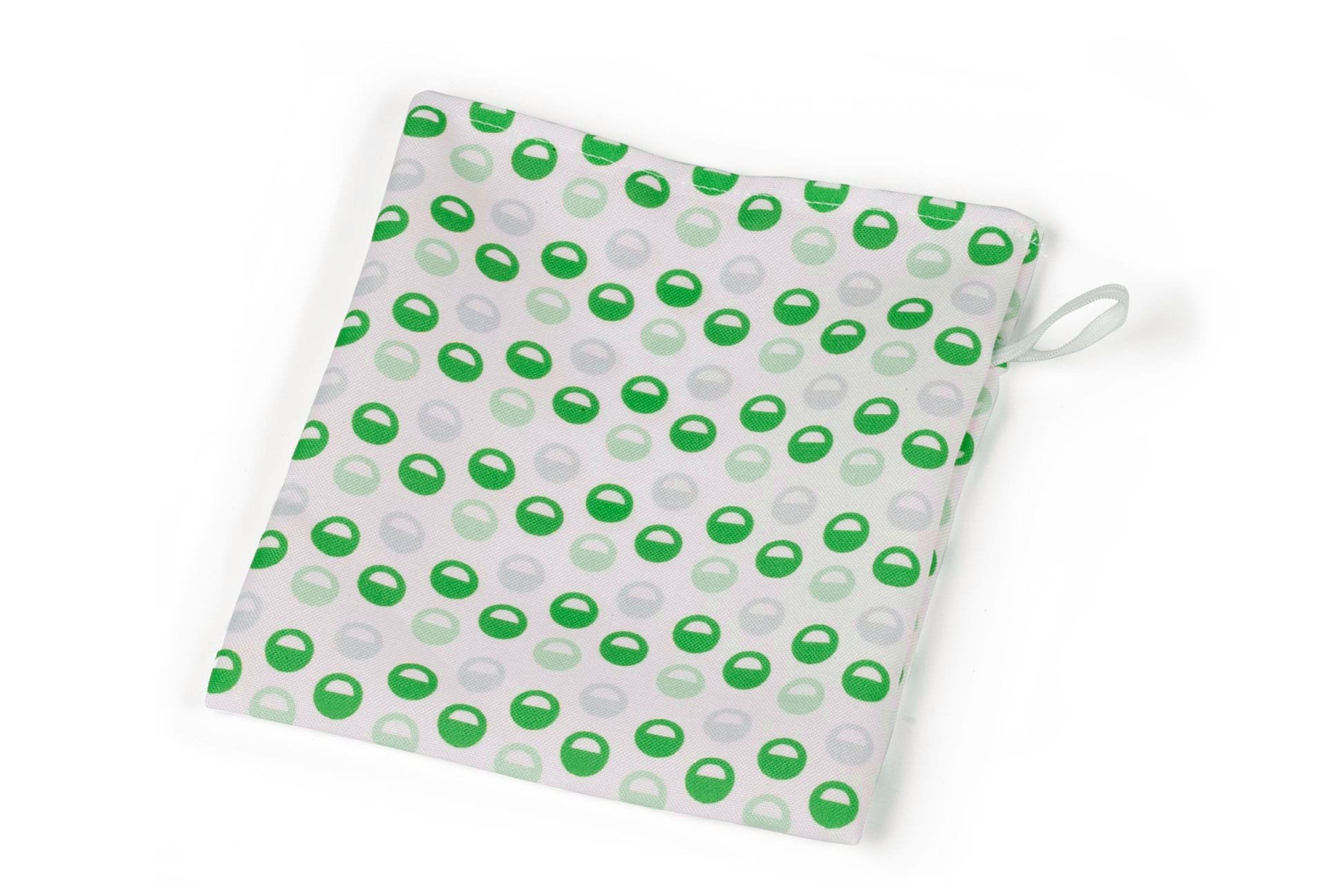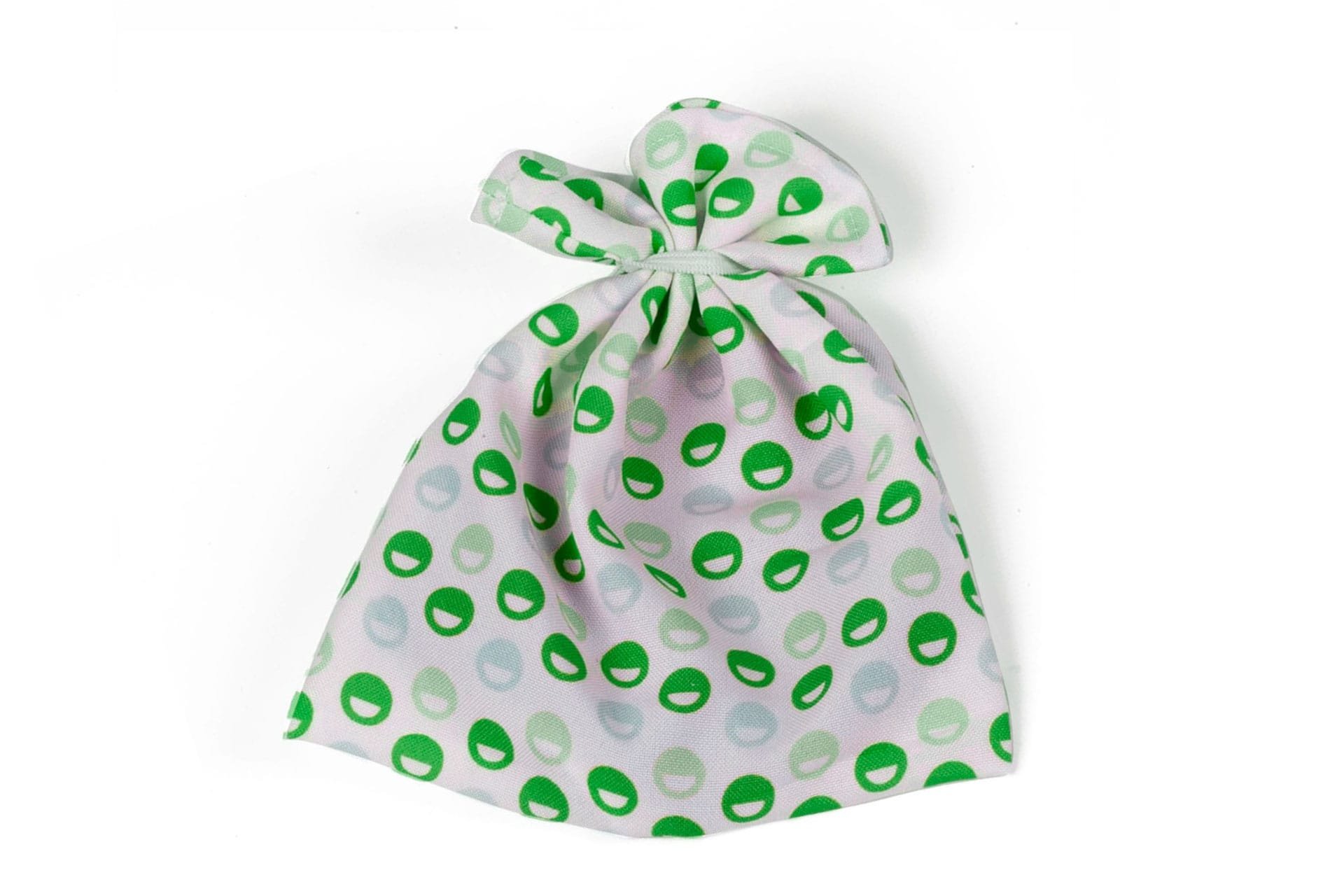 Small cloth mask holder bag with a rubber band to close it.